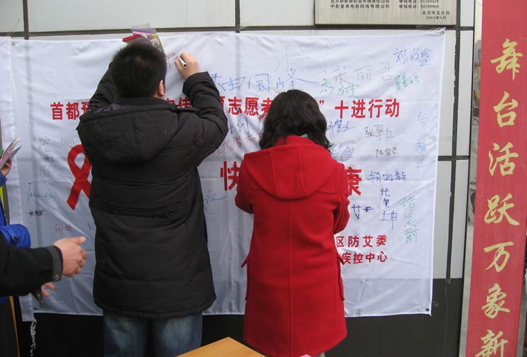 怀柔 志愿者将红丝带别在主题横幅上