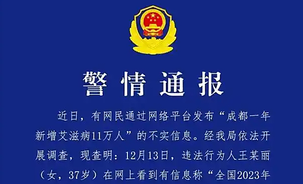 通报称,近日,有网民通过网络平台发布“成都一年新增艾滋病11万人”的不实信息。经该局依法开展调查,现查明:12月13日,违法行为人王某丽(女,37岁)在网上看到信息称“全国2023年新报告艾滋病病例11.05万例”后,未经核实便将上述数据恶意嫁接…