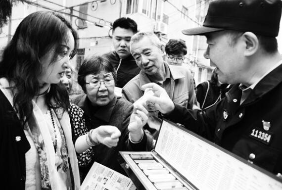 4月25日,江苏省镇江市公安局润州分局禁毒大队与和平路派出所民警走进金山社区,开展“远离毒品、健康生活”活动,通过向居民宣讲毒品的危害及禁毒知识,增强市民对毒品的防范意识。图为民警向居民宣讲毒品的危害。