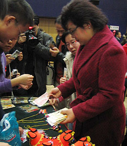 现场一角,由地坛“红丝带之家”的艾滋病患者亲手制作的手工艺品义卖引来与会领导与志愿者们纷纷解囊,一位男子花一百元钱卖走了一只可爱的布老虎,另一位大姐索性掏出两百元把十来个手机链包圆了,“这些小工艺品的价值是没法用金钱衡量的,只要能为防治艾滋病奉献一份爱心,这钱花得就值!”据了解,义卖的全部款项将用于艾滋病感染者的救助。