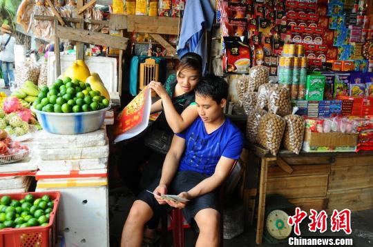 越南年轻夫妇在看志愿者发放的防艾宣传材料。