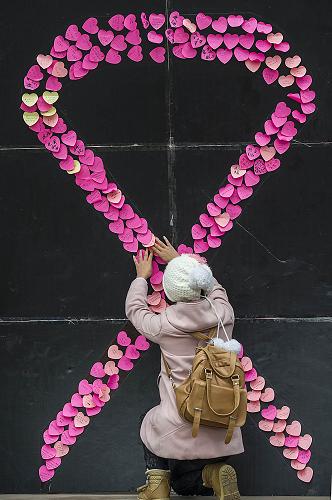12月1日,一名游客在“防艾献爱”活动留言板上贴上自己的防艾宣言。当日是第25个世界艾滋病日,重庆市洋人街景区工作人员和重庆交通大学的大学生们联合举办“防艾献爱”系列活动,通过街头拥抱、千人签名巡游等活动,向市民宣传如何正确对待艾滋病和不要歧视艾滋病人。