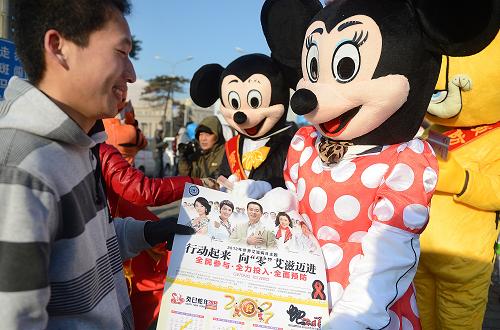 12月1日,志愿者身着卡通服装向路人发放艾滋病预防宣传单。当日是世界艾滋病日。吉林省卫生部门在长春市人民广场开展以“行动起来,向‘零’艾滋迈进”为主题的防治艾滋病宣传活动,向群众普及艾滋病防治知识。 新华社记者 林宏 摄