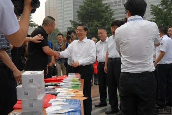 图为郭声琨向市民赠送禁毒宣传用品