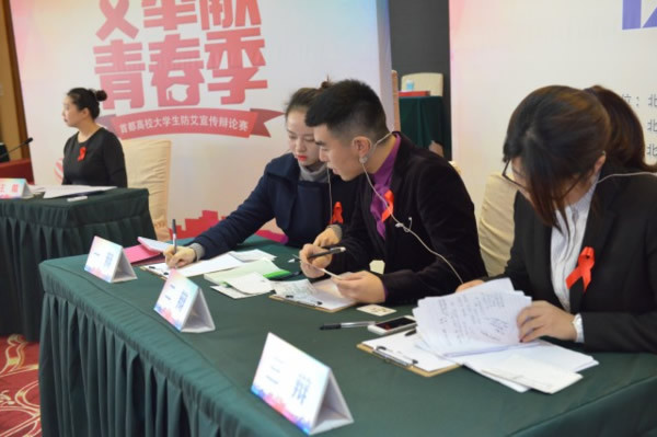 竞赛现场邀请中央民族大学老师,李依霖博士担任辩论主席,在有序的组织工作下,24支参赛队唇枪舌剑,言辞流利,宣传防艾知识,展示防艾观点,一场场精彩辩论席卷而来。