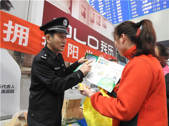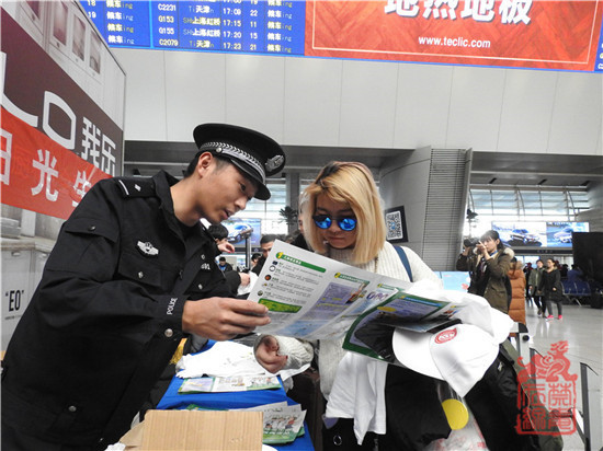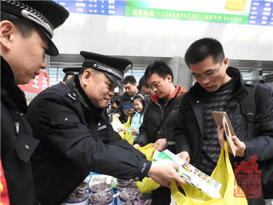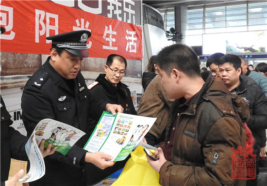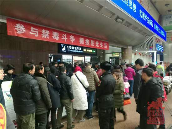 2月9日,北京市禁毒办、市公安局禁毒总队、市铁路公安局等相关领导及工作人员带领志愿者在北京西站、北京南站候车厅向广大旅客宣传毒品危害知识,发放禁毒宣传品。禁毒志愿者对照仿真毒品模型向现场群众讲解各类毒品的构成及成瘾原理,并对群众提出的问题认真详实的逐个解答。现场群众积极通过手机扫描“中国禁毒”和“北京禁毒”二维码加关注的方式获赠禁毒宣传品的环节,使活动达到高潮。