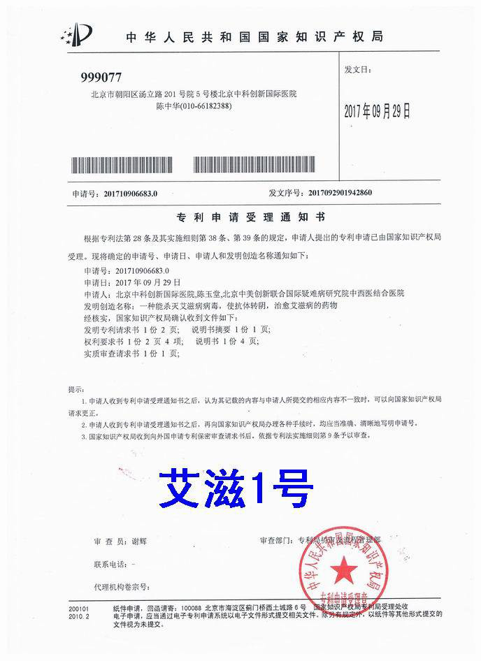 北京中科创新国际医院发明了一种能杀灭艾滋病病毒,使抗体转阴,治愈艾滋病的药物[艾滋1号],现已通过中国国家知识产权局申请发明专利。本发明涉及一种能杀灭艾滋病病毒,使抗体转阴,治愈艾滋病的药物[艾滋1号]为纯中药制成,具有治疗效果好,副作用小,疗程短等诸多优点;有增强人体自身免疫力,杀灭艾滋病病毒的功效,使HIV抗体转阴,能彻底治愈艾滋病的特点。治疗艾滋病及艾滋病并发的各种疾病有见效快,治愈后不复发的特点。30天为一个疗程,一般一个疗程见效,三个疗程左右可以治愈。