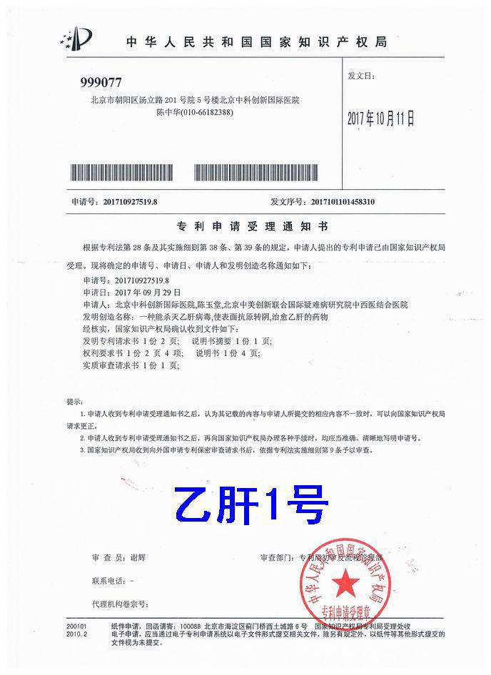 另外;现在有人说乙肝不能治愈是有阴谋的,美国葛兰素史克公司对中国国家和非国家工作人员和单位行贿,让有关部门和医生说服乙肝患者终生必须服用葛兰素史克生产的贺维力(通用名阿德福韦酯)和贺普丁(通用名拉米夫定),每人每月要花费好几百上千元,中国这么乙肝病人,大家可以想想就知道了,现在对艾滋病也是如此,终生必须服用他们的药,其实艾滋病吃中国的中药就能治愈。北京中科创新国际医院发明了一种能杀灭艾滋病病毒,使抗体转阴,治愈艾滋病的药物[艾滋1号],现已通过中国国家知识产权局申请发明专利。本发明涉及一种能杀灭艾滋病病毒,使抗体转阴,治愈艾滋病的药物[艾滋1号]为纯中药制成,有增强人体自身免疫力,杀灭艾滋病病毒的功效,使HIV抗体转阴,能彻底治愈艾滋病。
