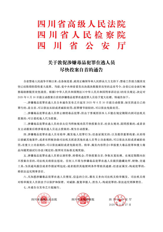 图为《关于敦促涉嫌毒品犯罪在逃人员尽快投案自首的通告》。中国禁毒网发