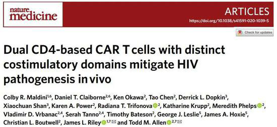 《自然-医学》杂志近日上线了一篇艾滋病研究的新论文。由宾夕法尼亚大学佩雷尔曼医学院(Perelman School of Medicine)Jim Riley教授和哈佛大学拉根研究所(Ragon Institute)的Todd Allen教授合作领衔的研究团队,介绍了一种新型双特异性CAR-T细胞免疫疗法,可以帮助对抗HIV感染。