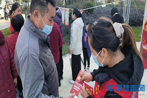 图为禁毒志愿者向群众发放禁毒宣传手册。中国禁毒网发
