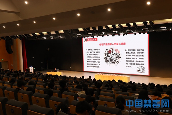 讲座中,禁毒民警通过播放视频的方式,结合自身工作经验,向在场学生讲解吸食毒品和贩卖毒品的社会危害,让在场学生懂得“防毒、拒毒、禁毒”知识,扫除“禁毒”知识盲点。