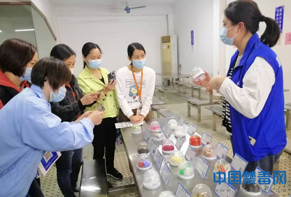 图为禁毒社工向职工展示毒品仿真模型。中国禁毒网发