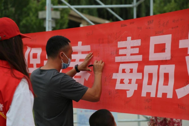 图为大家积极地参与禁毒防艾宣传活动,并在横幅上签字