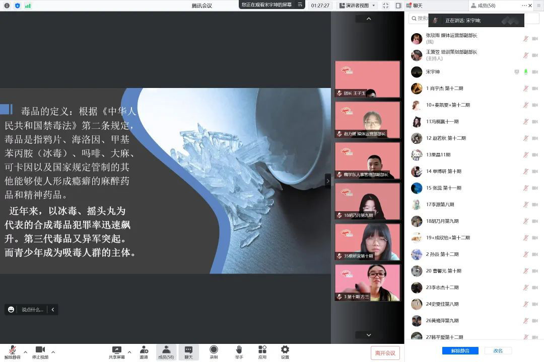 首都高校“青春红丝带”社团工作领导小组办公室项目主管宋宇坤老师为成员们进行禁毒相关知识的讲授。