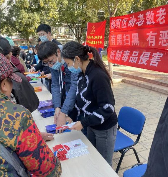 禁毒工作人员在活动现场悬挂禁毒宣传横幅,张贴禁毒宣传海报,向参加活动的群众发放禁毒宣传资料和禁毒宣传品,为大家介绍生活中常见毒品的种类、毒品的危害及吸毒成瘾后的症状,提醒广大群众在日常生活中一定要提高防范意识,保护自己和家人免受毒品侵害,坚决远离毒品。