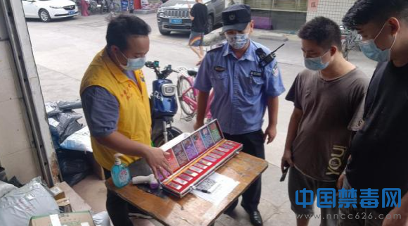 图为禁毒专干及派出所人员向快递人员展示毒品仿真模型。中国禁毒网发