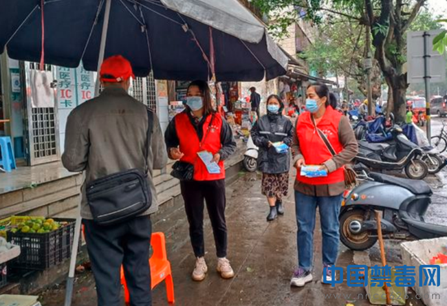 图为禁毒志愿者向群众发放宣传手册。中国禁毒网发