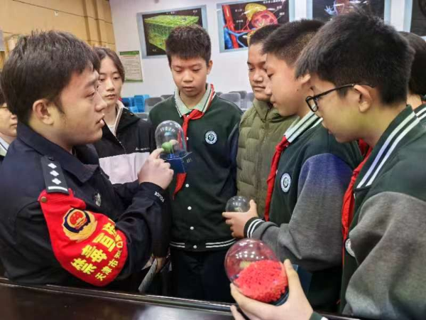 活动现场,派驻警察从毒品的种类、危害和中学生如何防毒以及禁毒相关法律法规等四个方面进行了详细的讲解,并通过展示毒品仿真模型,发放禁毒宣传册等多种形式,引导同学们树立正确的人生观,提高识毒、防毒、拒毒意识。派驻警察还特别提醒学生们如何防范伪装成奶茶、跳跳糖等饮料、零食样式的新型毒品,提升学生们对新型毒品的甄别能力,并且鼓励学生们做禁毒工作的小宣传员,将所学禁毒知识宣传给家人,与家人一同拒绝毒品、珍爱生命,携手共建和谐家庭。