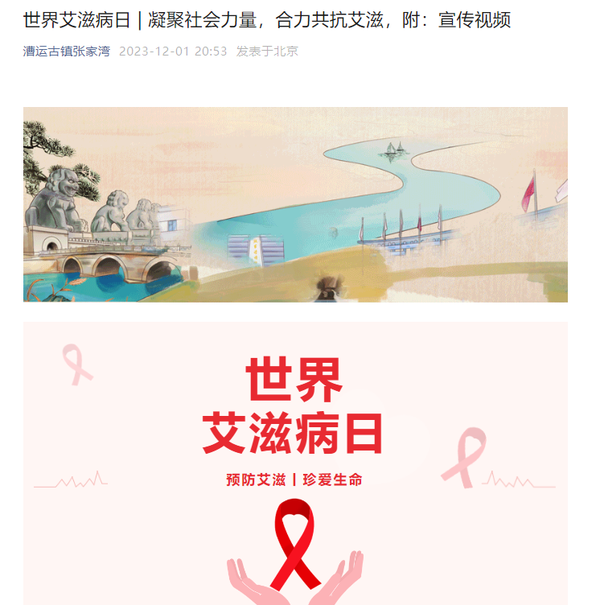 根据北京市通州区防治艾滋病工作领导小组办公室关于开展《通州区2023年“世界艾滋病日”主题宣传活动的通知》要求,为进一步推动艾滋病防治工作高质量开展,宣传普及艾滋病防治知识,依法深入推进艾滋病防治各项工作,营造全民参与艾滋病防治工作的良好氛围。按照通州区张家湾镇活动工作部署,结合工作实际,开展世界艾滋病日宣传活动。