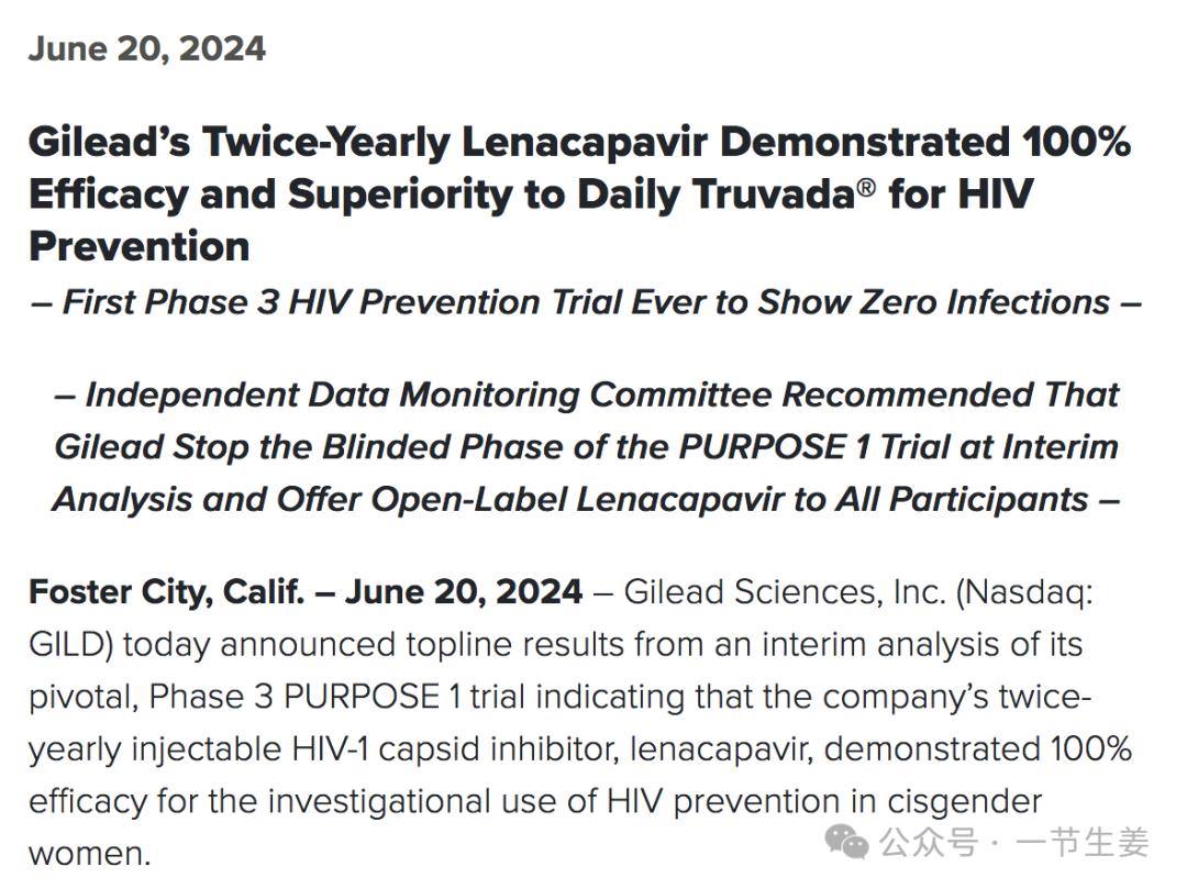 6月20日,美国生物制药公司吉利德在其官网发布重磅消息:在3期临床试验中,艾滋病(HIV)预防新药“Lenacapavir”(来那卡帕韦)达到了100%的有效率。