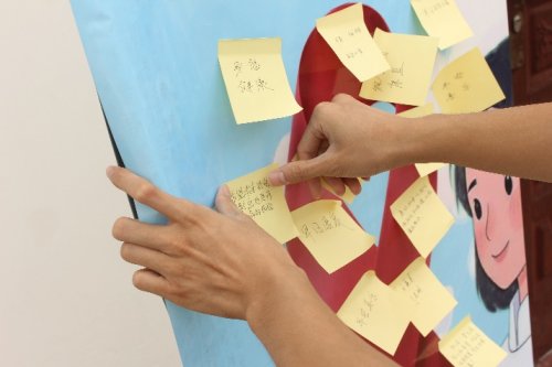 在知识科普活动有条不紊进行的同时,实践团队开展了充满温情的“祝福征集”活动。团队以象征关爱与希望的“红丝带”为主题,精心布置背景展板,诚挚邀请过往行人在便签纸上为艾滋病患者写下鼓励与祝福。“愿你们被世界温柔以待”“疾病不可怕,歧视才可怕”“拥抱阳光,拥抱希望,你们并不孤单”……一句句温暖人心的话语,承载着社会各界对艾滋病患者的深情厚意与精神支持。行人写完祝福后,亲手将便签粘贴在红丝带展板上,这些便签迅速汇聚成一面满含关爱的“祝福墙”,不仅为艾滋病患者送去了力量,也向全社会发出了消除歧视、传递关爱的强烈呼吁。